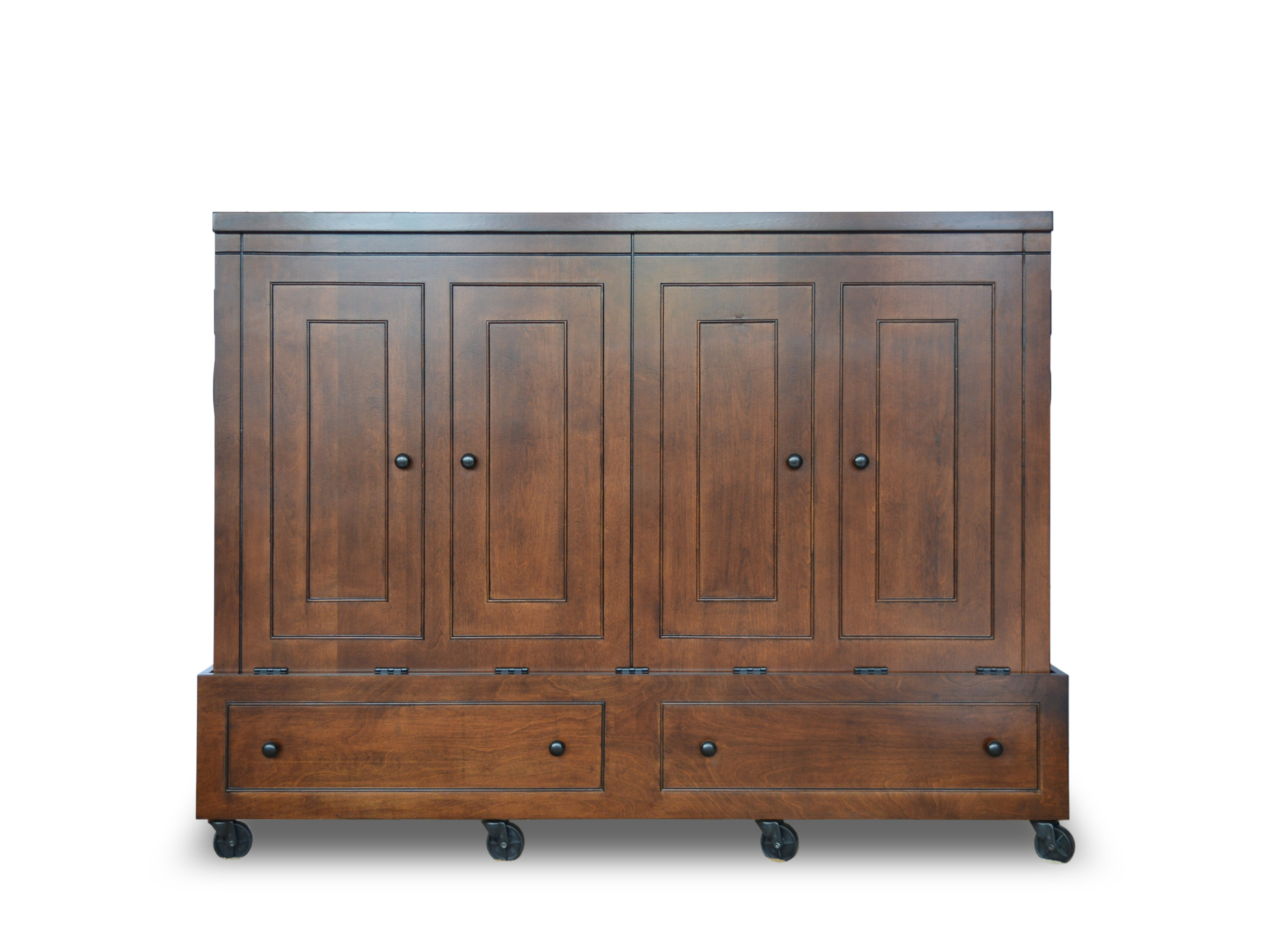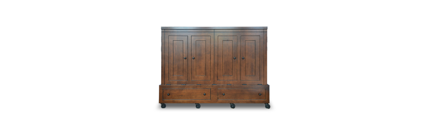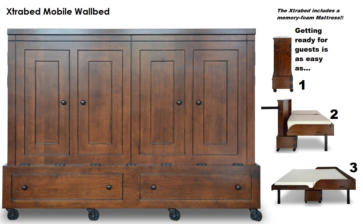 The Xtrabed is all solids and veneers (real wood- not paper or plastic) on poplar plywood, and is finished inside and out. Heavy-duty steel brackets, hide-away legs, and big smooth-rolling wheels ensure that the Xtrabed is built to last. And the Xtrabed ships completely assembled- it’s ready to use right out of the box!